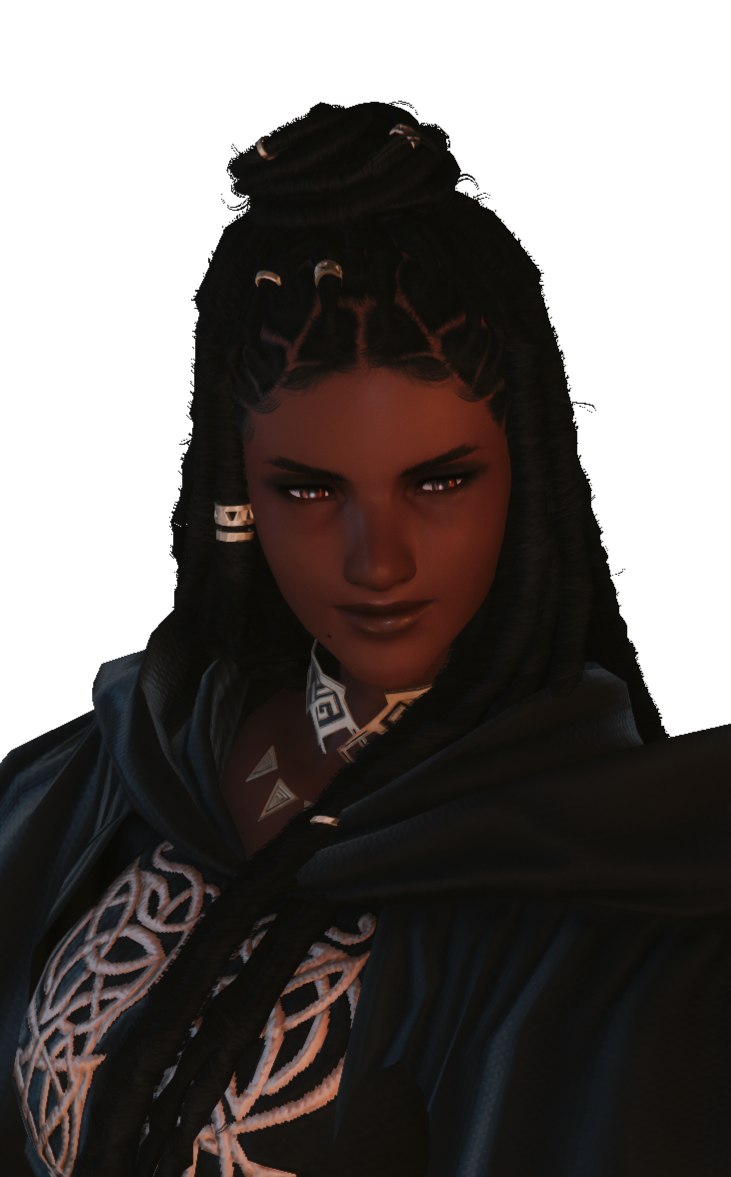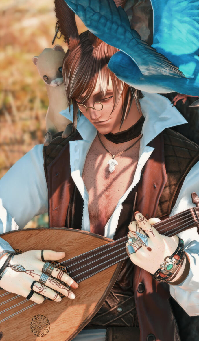 “While the deeds and exploits of the Warrior of Light are well known throughout Eorzea and the Star, a majority of Eyrie Kisne’s life prior to the Seventh Umbral Calamity remains unknown. Most of what is known has been gleaned by members of the Scions of the Seventh Dawn during Eyrie’s tenure within their ranks; while other accounts remain within word of mouth, or in paper documentation. Even as such, many closest to them are remiss to speak on matters of the Warrior of Light’s personal history.”“What little is known is discussed below:”“Eyrie was born into an unknown Veena village within the Skatay Range boarding Othard and Dalmasca over a hundred years ago. In reminiscing, they remarked that their village lived a semi-nomadic and isolated lifestyle, tending to various outposts deep into the mountains peaks and glacier valleys. This was born out of necessity compared to other Viera villages as a means of tending to their herds of mountain sheep. The village did have a stable main settlement most of the year within the deep upper valleys of the mountains, and only in the winter they would relocate below the tree line to temporary outposts.""They were raised alongside a fraternal twin brother, along with their two older sister's four children; they were all a rather rambunctious bunch, stirring up both trouble and help in equal measure. Eyrie was the quiet and unobtrusive one of the bunch--an avid observer rather than participator--even in their own childhood. Words came to them slowly, parsing their thoughts a difficult endeavor. It kept them at a distance--their slowness and uncertainty amongst others who moved and talked far more than them paralyzing.""Often as a result they preferred to let their brother speak for them rather than voicing their own thoughts. Letting him take responsibility for them as their older of the two.""Outside of time spent with their twin, they were ever close to their mother. So much so they would rather spend time with her than their fellow children. They had an avid enthusiasm in her work with medicines and white magic, albeit they were not blessed with later innate talent like their twin. Many of their fleeting memories of her are ones of her tender magic, her deep innate sadness--one they never quite learned the cause of--and her delicate embroidery work.""As the years crawled by and they grew older, they would spend more time with their father when he returned to shelter during the harsh winters, learning to wield bows, knives and lances--tools that would serve them well when it came time for them to join their father in the wilds. They excelled the most with the bow, and came to share their father's love of song and poetry, eventually marrying all three into what the people of Gridania and the Shroud refer to as a Bard.""They became a Wood Warder at the age of thirteen when they hit puberty as is both their choice and custom, and it would be a position they would hold for over a century. Tis a time in their life Eyrie speaks the least about and is remiss to touch upon. Once they spoke of the death of their father when they were eighteen--a great fall, caused by thick ice on trusted rocky hand holds. It would be an accident they nevertheless would take blame for, and would drive a wedge between Eyrie and their mother.""They would talk briefly after the events of the Final Days about having once taken a wife, and the pair had three children. One of whom died not long after her birth, the others now fully grown. Their eldest, a daughter named Aoife, resides within the city state of Ishgard. Their second eldest, a son named S'ver, still lives in the Skatay range. Neither have seen each other in many long years."