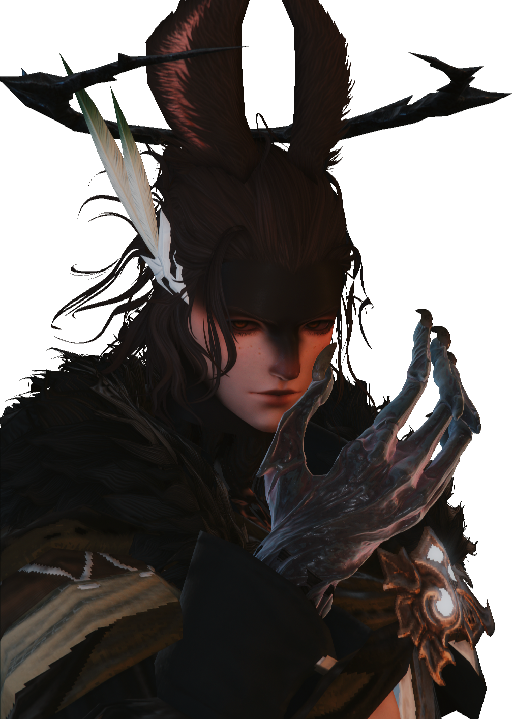 “Over the following years as tensions rose with the Garleans, they took on adventuring with several mercenary companies free Paladin and Bard, working within La Noscea, Coerthas and Thanlan--even so far as Gridania and the edges of Gyr Abania. References, curiously enough, include their tangential employment amongst the newly reformed Grand Companies of Eorzea, as well as a mercenary for The Circle of Knowing in the months before the Calamity. This work would bring them almost to ground zero of the Calamity--when Dalamud fell from the sky and Bahamut burst forth from his allagan prison.""Varied word of mouth accounts from civilians to soldiers not far from the destruction in Coerthas describe a strong willed Viera protecting and guiding them to safety during that vicious battle. More accounts follow of their wandering through the remains of the battlefield in search of survivors and the deceased with the hope of returning them back home."As the Grand Companies took over the work, they journeyed back up into the Coerthas Highlands to seek out the Ishgardian Paladins who survived. Together with what remained, they traveled across the rapidly changing highlands seeking out villages and hamlets, hoping to provide what assistance they could. Alphinaud Leveilleur's reports of the Dragonsong War made mention of Eyrie telling brief stories of the places they encountered. Villages buried beneath ice and snow in a matter of weeks. Finding homes with families huddled together, having all frozen to death. It was tiresome work and eventually they took their leave of the Paladins once more, returning back to Eorzea.""Eyrie tells it that they spent much of their time in Ul'dah working with Momodi of the Adventurer's Guild, trying their best to help the refugees and those most displaced by the Calamity. They often saw the worst Ul'dah had to offer over those years from both the citizenry and those in power.""It's not until five years after the Calamity that there officially arises the name Eyrie Kisne within the log books of the Adventurer’s Guild in Ul’dah. Momodi tells it that up until that point, Eyrie had never given her a name to record within the logs. Archon Thancred Waters recalled often seeing them spending time in the Quicksand taking on jobs and spending free time chatting with Momodi. He too never learned of their name.""At Momodi's recommendation due to their skill and talents, they made the journey to the Archer's Guild within Gridania. there eyrie's name appears within the logs of the Adventurer’s Guild within the city state--one step along the path that would lead them to becoming the fabled warrior of light. the defender of our star."
